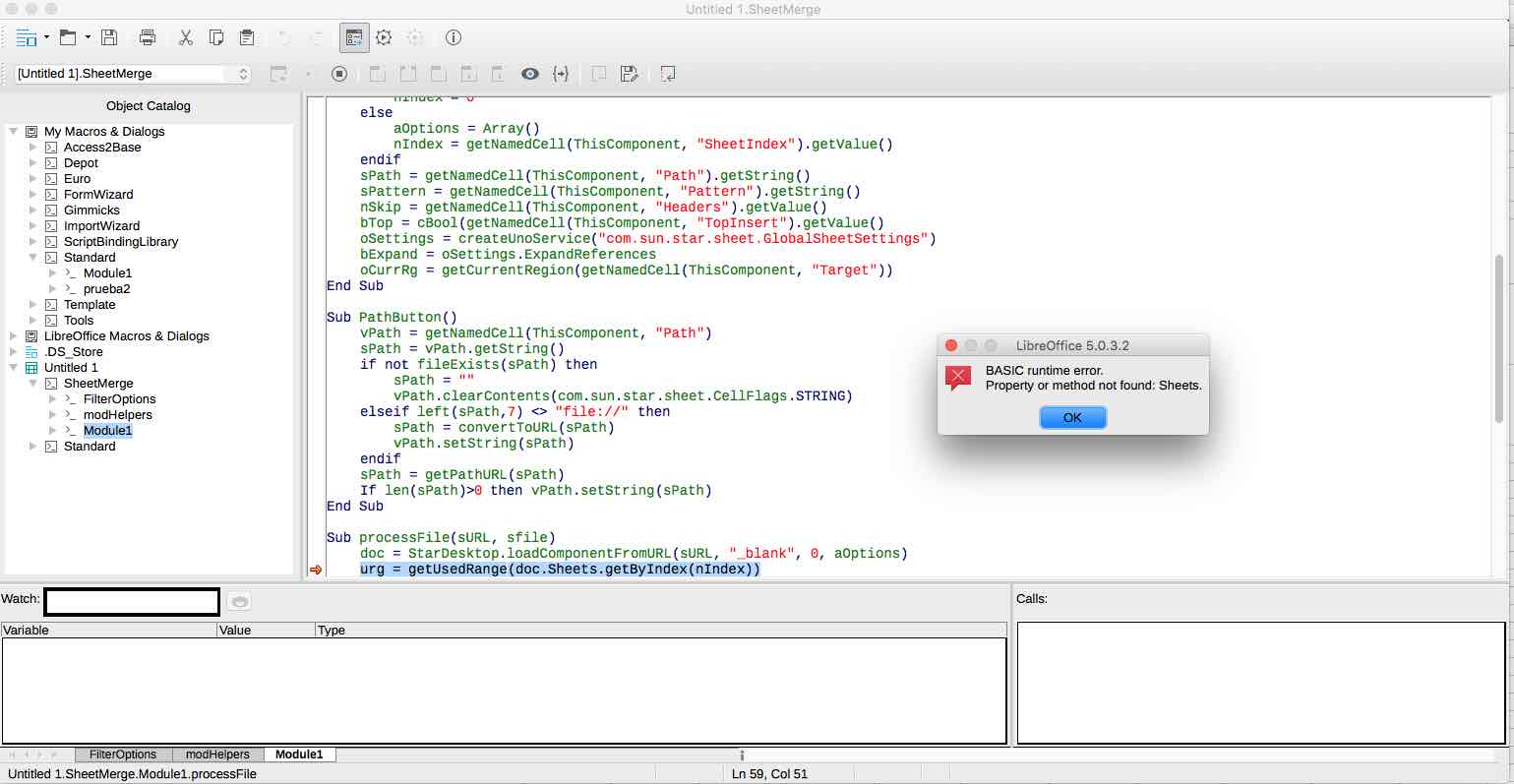 3) Tools>Macros>Organize>Basic... button [Organize...], tab "Libraries", select your own document under "Location", click [Import...], point to my template file and import library "SheetMerge" from my file into your own.