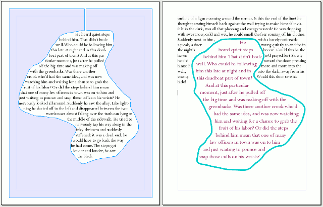 That works, but only to the extent that I can type. I still can not find how to make the text contour to my borders unless they are straight lines. I need to manually add Tab and Spaces in order to move the text, line by line, into position around my work. Also the background graphic gets cut off (erased) unless I bring the text borders to the very edge of the page.
