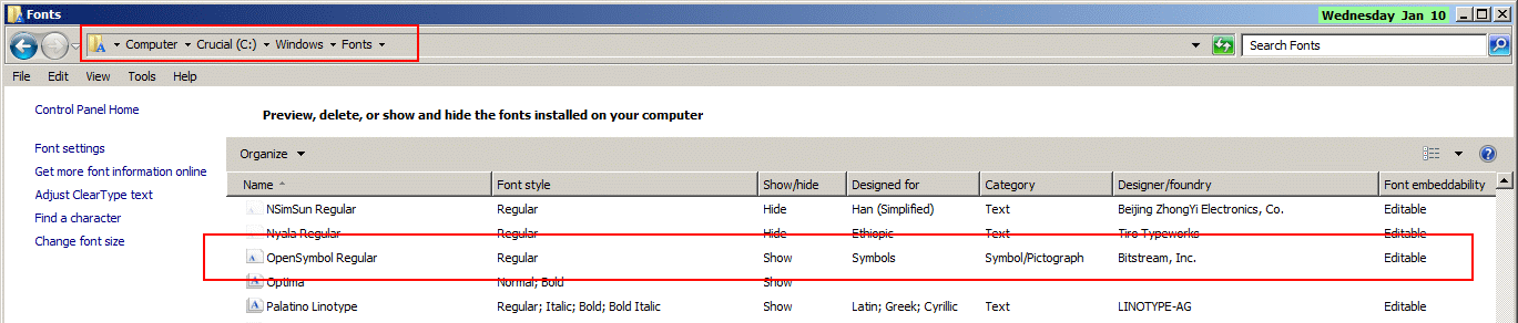 1. Do you have the Open Symbol font installed? Go to C:\Windows\Fonts - this is what I have on W7