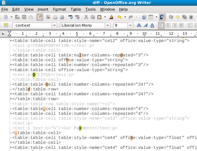 - after unzipping you get bunch of files and directory's under repair , find content.xml and open it whit your favorite text editor -> "$ kate content.xml"