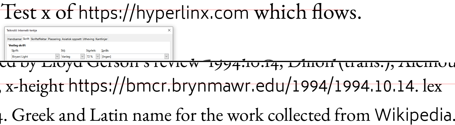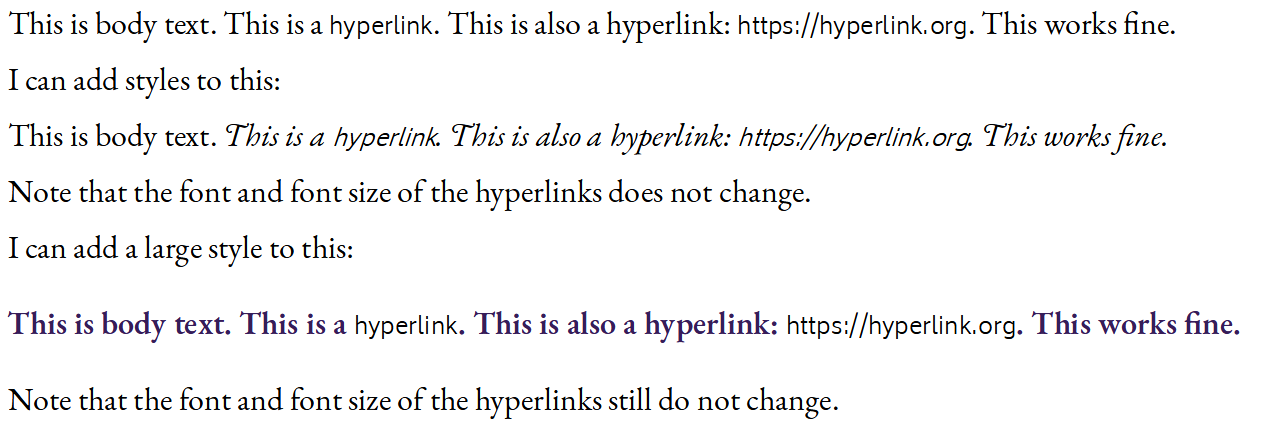 - As can be seen, the font size is set to the correct size (8.2 points), but the actual size used, is that of the default hyperlink style (which I have formatted to 9.8 points to match the x-height of the main body text).