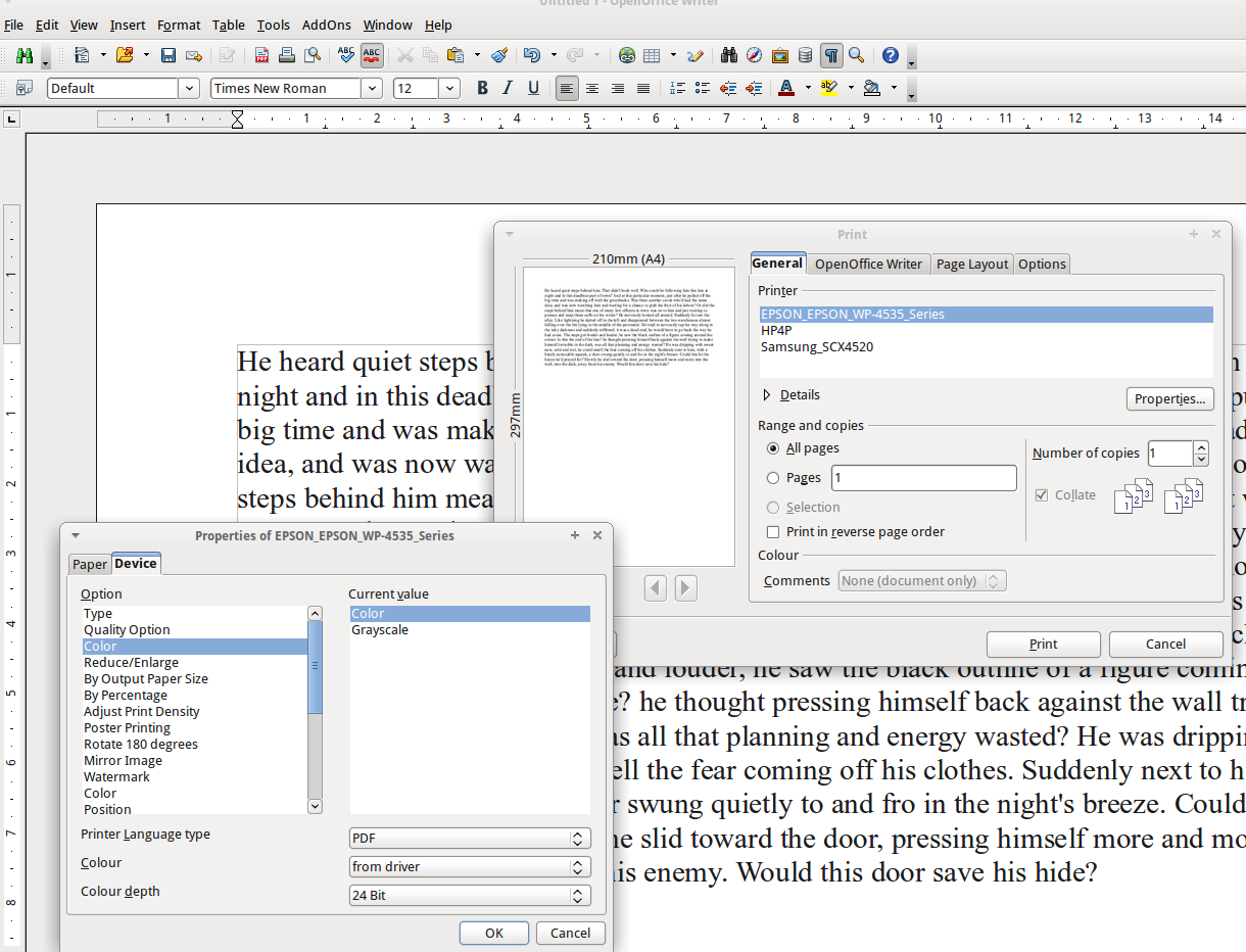 I can print other types of files in color but not documents created in Writer. The layout and print preview shows color but documents print in black and white only. Is there a master setting for this?