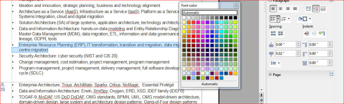The second is in the colored text fragment, select "Format → Character → Font Effects". In the "Font color" field, a rectangle with the text color and the verbal name of the selected color will appear. When you move the mouse pointer over the color board, the names of the indicated colors appear.