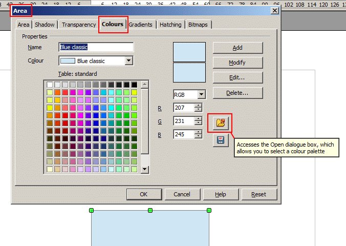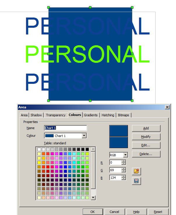 As can AOO. right-click a drawing object > Area > Colours ...Zizi64 wrote:The LibreOffice can handle more than one palettes. You can switch between the installed palettes.