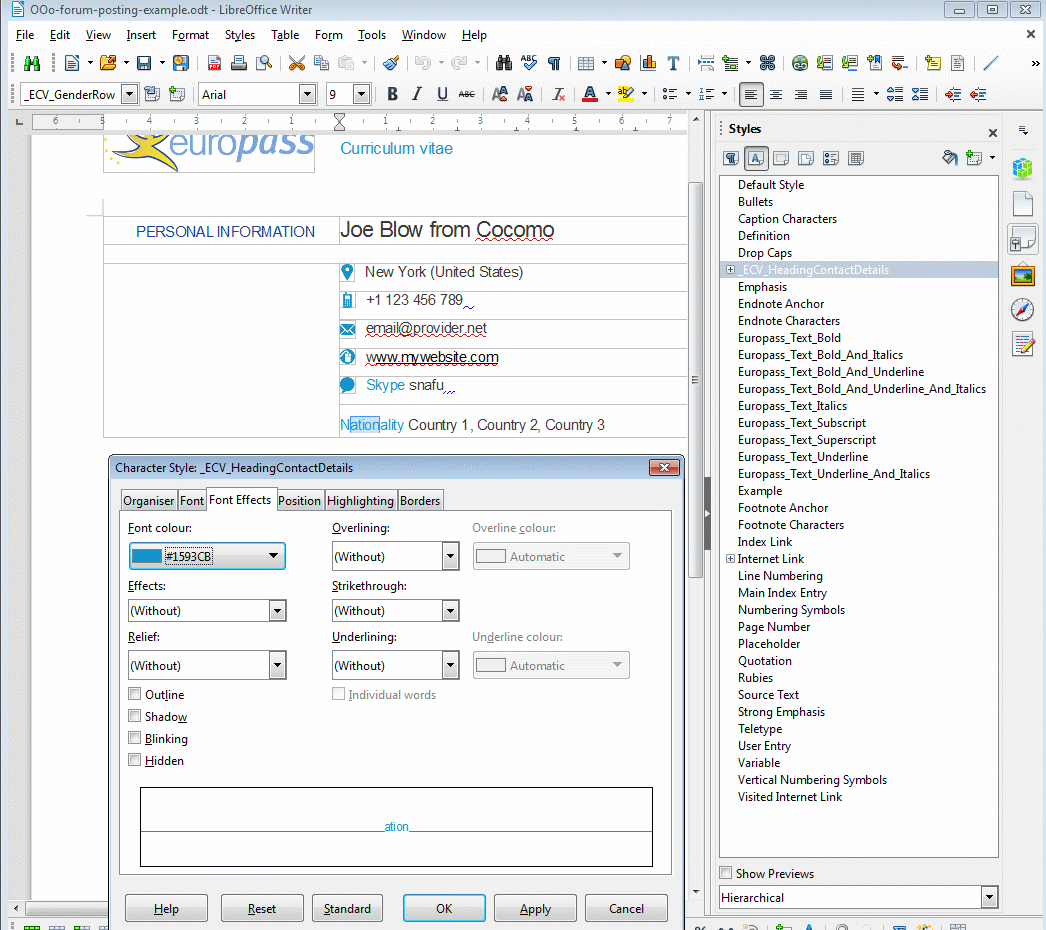 Please find attached a small sample file that exhibits the problem. If you right-click on I believe any of the text that looks black except one of them, and select Format -> Character... you will see that the font color (on the "Font Effects" tab) shows the name "User".