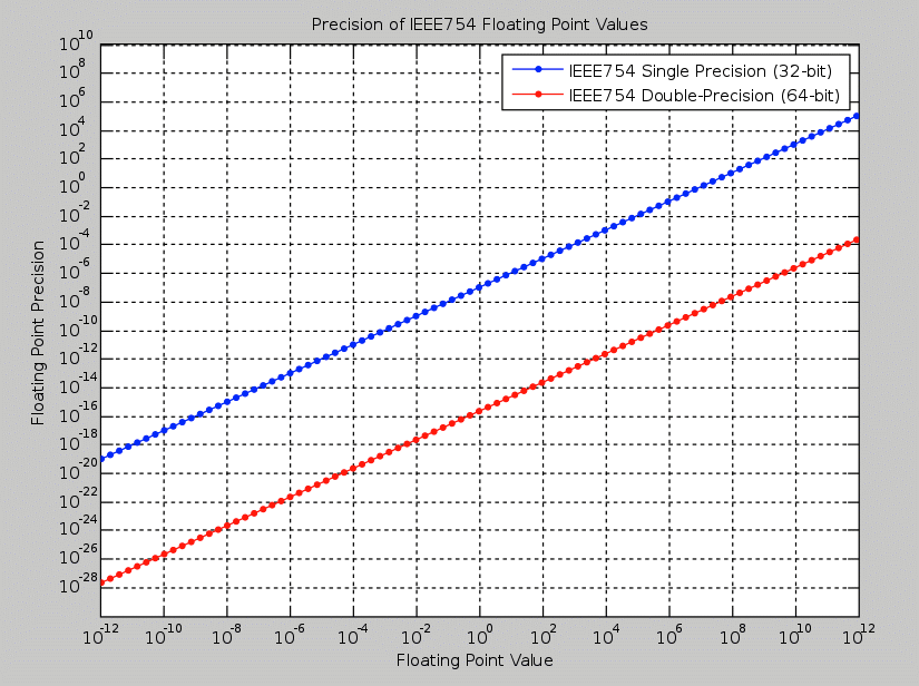 Now that you have reminded me of the Galactic Land Registry Office I think I shall have to move to using the full range of floating point numbers, both floating point and integer. The smallest number Calc recognises is then about about 10^-308, which is 0. followed by 307 zeros followed by 1. The largest number is about 10^308 which is 1 followed by 308 zeros. While the relative error remains constant across the range the absolute error varies and is proportional to the magnitude of the stored number: a small number has a small error and a large number has a large error. IEEE 754 has this graph.