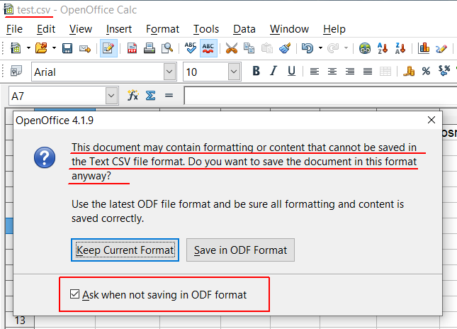 When I open a .csv file and Save, or click the save icon, I get this pop-up which warns me formatting and content may be lost if I save as a .csv file and urges me to save as a .ods file.
