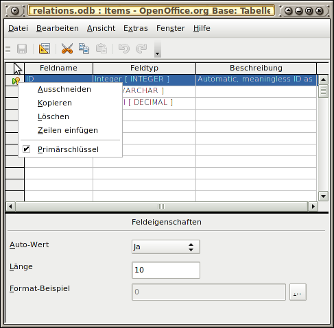 Tools>Relations... indicates which tables have relations and that all the relations use primary keys (yellow key icons). Primary keys provide unique pointers to each single row of a table (some ID number). A primary key makes tables editable in Base.