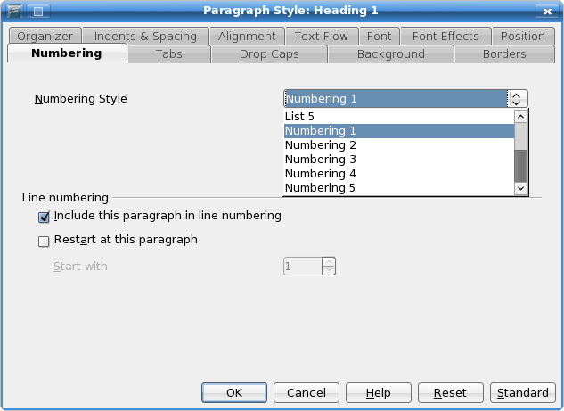 If you want the number to look different from the rest of the heading paragraph, choose a character style in that drop-down list. You can create your own character style in the Stylist (the Styles and Formatting toolbar) if you want, and it will appear in this drop-down list.