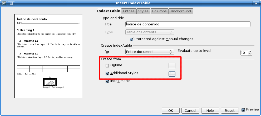 Go to Insert -> Indexes and tables -> Indexes and tables (or edit an existing TOC by right clicking on it -> Edit Index/Table). On the dialogue you will see, under “Create from” un-check “Outline”, check “Additional styles” and click on the button to the right of the “Additional styles” check-box: now, you can select the styles you need to include on the TOC and move them to the “level” that corresponds to each one using the arrows on the bottom left side of the window. One more tip: if you want to automatically include the word “chapter” before your Heading 1 style's number, you will need to edit the Numbering 1 style on the “options” tab.