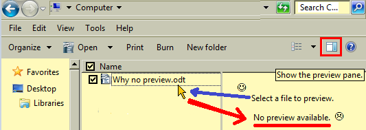 1) Document preview in the Windows Explorer preview pane, "not available" for any OO-format