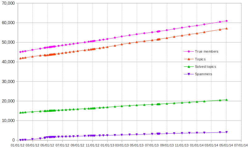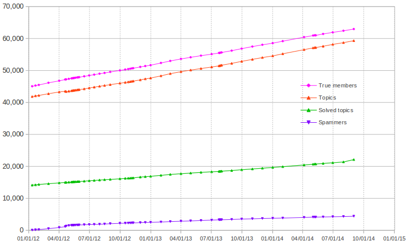I noticed a sharp drop in the number of new posts per day over the last few weeks or months. In the past we'd get as many new posts in a day as the Apache user mailing list in a month. Maybe most regular questions can now be solved by searching the forum, or maybe something else is going on.