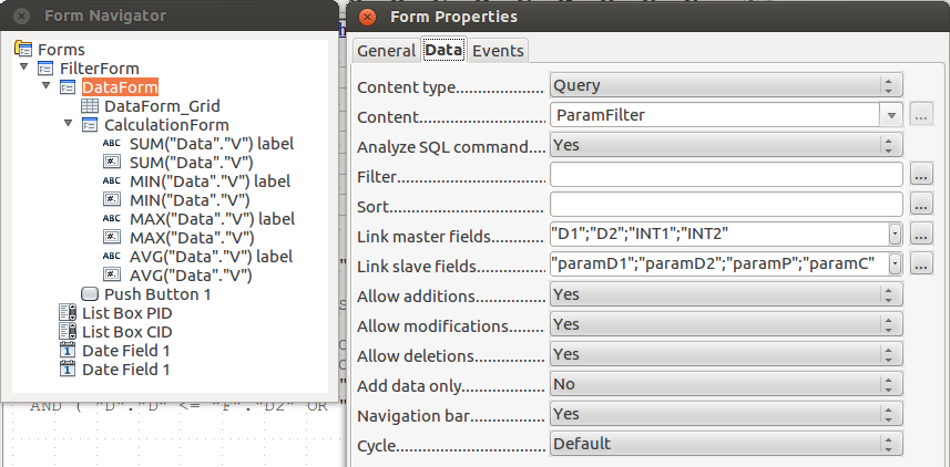 Study the properties on the Data tab of the filtering parent form "FilterForm" and its subform "DataForm".