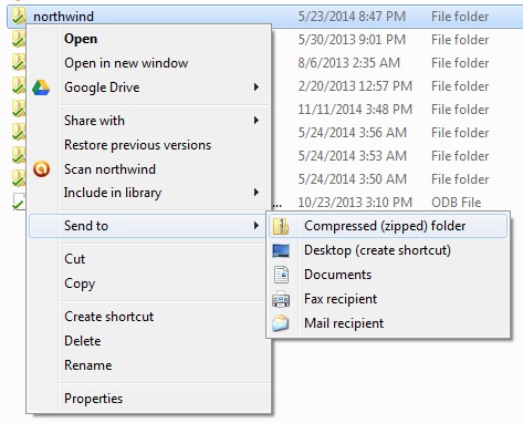 If you'd like to 'distribute' your split-database as a single file, optionally zip (compress) the entire split-database folder into a single file (.zip container file). This is a simple matter of right-clicking the folder icon and selecting the zip-archive option. For example, if you download the above template to a new folder named 'northwind' -- right-click the folder icon to zip the entire 'northwind' folder as follows (Windows method):