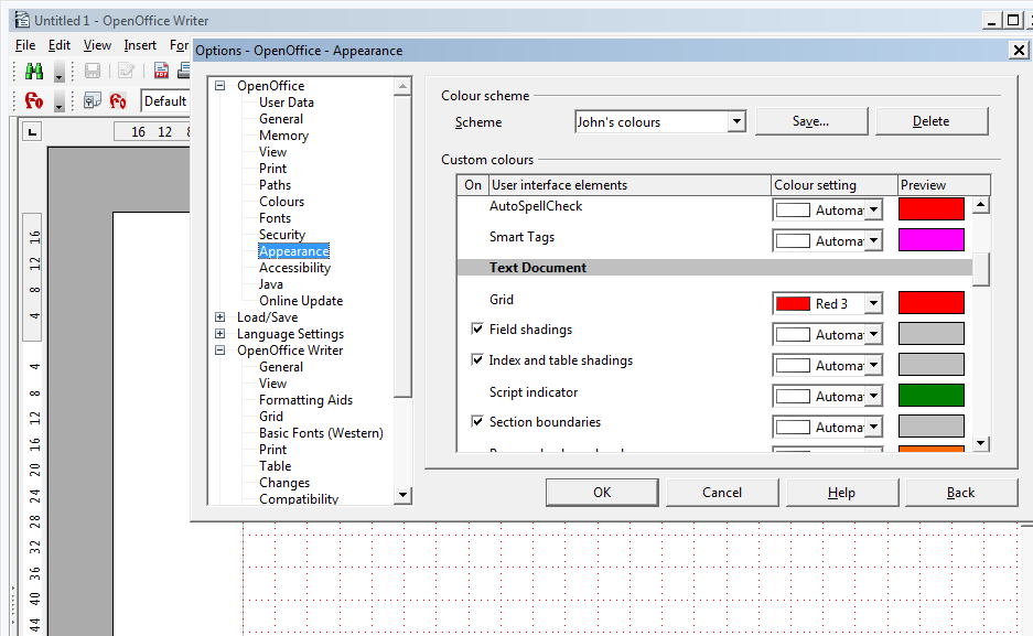 Tools - Options - OpenOffice - Appearance - Custom Colors - Text Document - Grid does not appear to affect anything. With Grid set to any color, the 1-pixel dots are always faint and black. Faint is good; colors would be better; even 2-bit Red-Green-Blue-Black would be an improvement, by differentiating the grid from the black text.