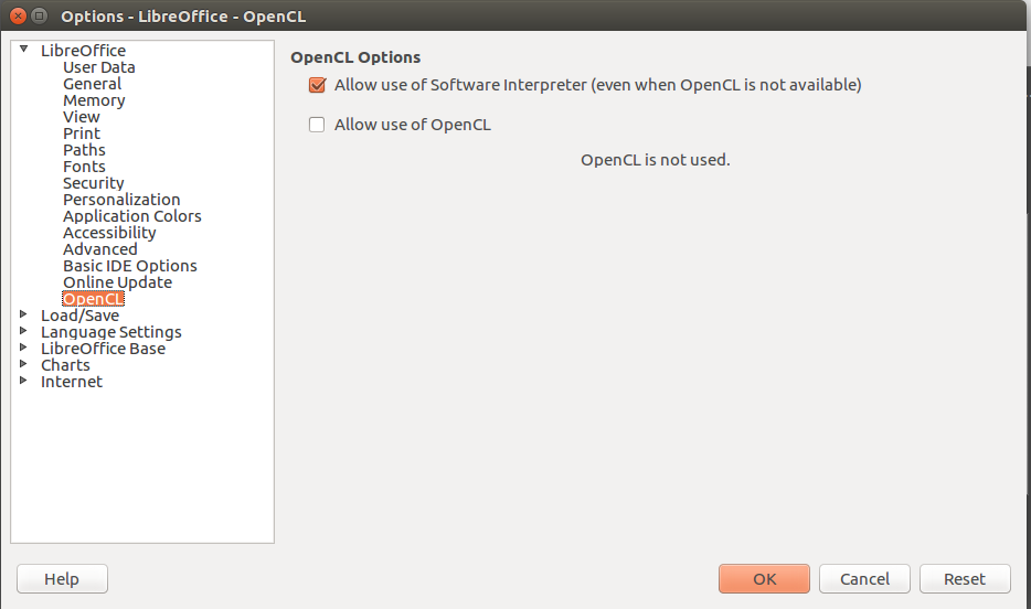 This is how it looks like with LO 5.3 on Linux: I hope that Open CL is the same as Open GL on Windows. But you get all options from the left tree of categories by navigating with up/down arrow keys and open/close the nodes with right/left arrow keys. Can your read dialog contents?