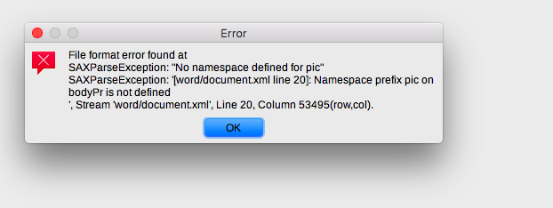 2. I have posted the code causing the problem below to see if anyone can identify the error in the XML. The tags look a valid pair. If that error can be fixed then the .docx file should open properly, with all content visible, in LO. Unfortunately I cannot find a similar set of tags to use as a template to make a correction. I am fairly certain that the " pic " is incorrect in both tags but I do not know what to replace it with.