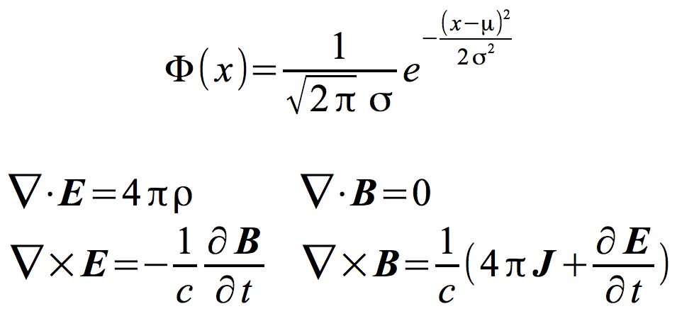 Some of the equations in your attached picture are wrong! In the definition of a deriviative (3), the second equal sign should be removed. In the normal distribution the square root should not extend over the standard deviation. And the exponent is missing a negative sign. If a mathematician is writing the article, there is little excuse for errors like that and if not, Ian Stewart should have consulted with one or at least checked in standard reference books. In Maxwell's equations, terms are missing unless the charge density and current density are both zero. I've fixed the problems in 7 and 11. I didn't check the rest. What a mess!beta wrote:any suggestions are most welcome