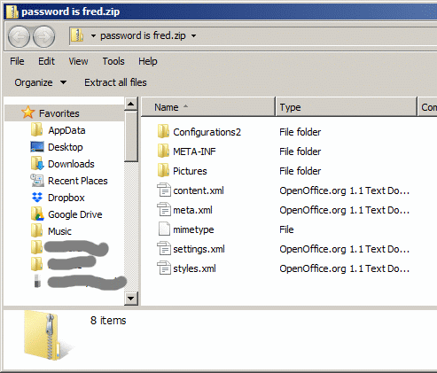 | Edit: I copied this from OASIS OpenDocument v 1.1 standard as it explains exactly how files are encrypted. I cannot upload the complete file here as it is 475kB. 17.3 Encryption The encryption process takes place in the following multiple stages: 1. A 20-byte SHA1 digest of the user entered password is created and passed to the package component. 2. The package component initializes a random number generator with the current time. 3. The random number generator is used to generate a random 8-byte initialization vector and 16-byte salt for each file. 4. This salt is used together with the 20-byte SHA1 digest of the password to derive a unique 128-bit key for each file. The algorithm used to derive the key is PBKDF2 using HMAC-SHA-1 (see [RFC2898]) with an iteration count of 1024. 5. The derived key is used together with the initialization vector to encrypt the file using the Blowfish algorithm in cipher-feedback (CFB) mode. Each file that is encrypted is compressed before being encrypted. To allow the contents of the package file to be verified, it is necessary that encrypted files are flagged as 'STORED' rather than 'DEFLATED'. As entries which are 'STORED' must have their size equal to the compressed size, it is necessary to store the uncompressed size in the manifest. The compressed size is stored in both the local file header and central directory record of the Zip file. |