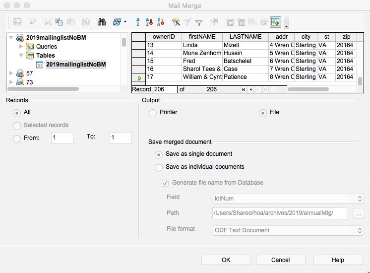 You print 206 records because your data source in Base has 206 records. This is shown clearly in your picture.airdrummer wrote:the print/mm dialog screengrabshows 206 recs in odb