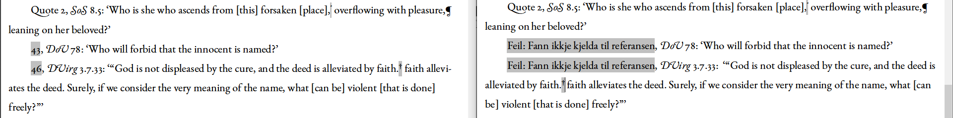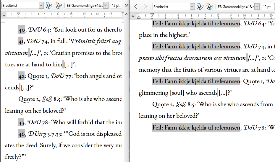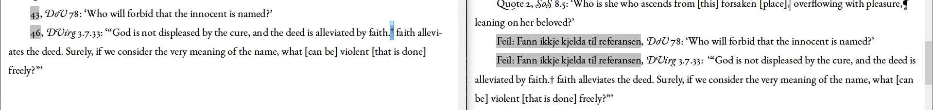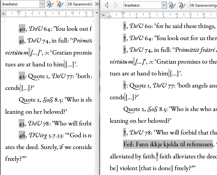 Today I encountered a bug I have never seen before in LO. I am using six different documents for an essay, due to some unwanted file corruptions occuring previously. (Again, thank you so much for saving the contents.) I have all my translations at the end of my main body text file, and at the end of day, I copy this to my appendix file. As expected, all the cross-references in the original file are reported as missing, but this is all solved when they are all merged in the master document. However, something unusual happened when pasting the final cross-reference today: Instead of being changed to ‘Error: Could not find source of reference’ (translated from the Norwegian prompt), the final cross-reference (and only the final one) was changed to cross-reference a custom footnote in the new file (pointing to an asterisk).