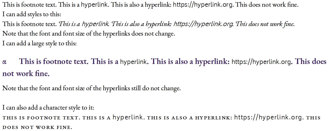 - As can be seen, the font size is set to the correct size (8.2 points), but the actual size used, is that of the default hyperlink style (which I have formatted to 9.8 points to match the x-height of the main body text).