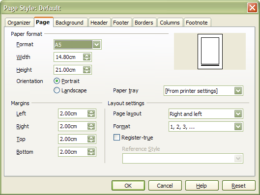 The second method is to resize the pages within your document to A5 and compose and edit them in that page size. At print time OOo will again place them in the appropriate order on landscape A4 sheets but it will not need to reduce them in size, because two A5 sheets are exactly the same size as a sheet of A4. The advantage here is that it is What You See Is What You Get – the font sizes you use are the font sizes that will be used in the printed version.