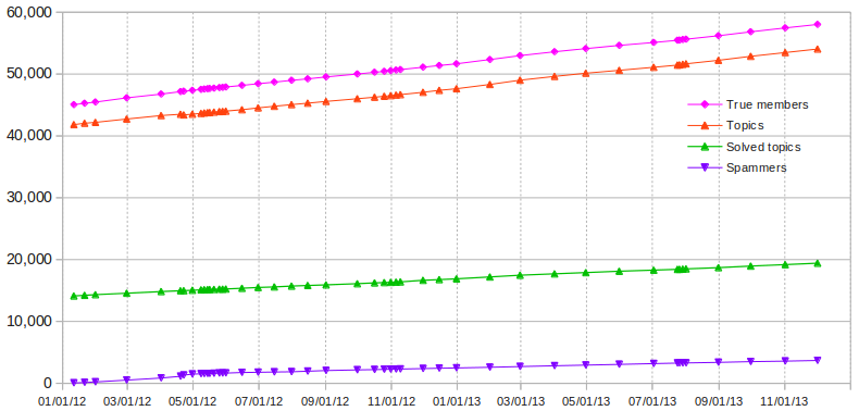 We hit a good mark: 60,000 real users (that means total users registered minus spam accounts). It was during April.