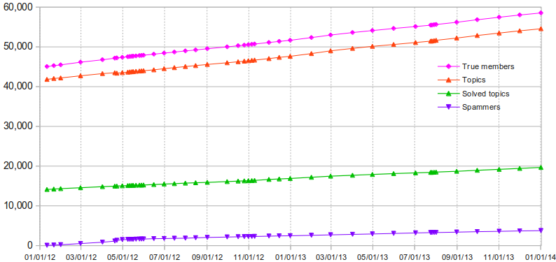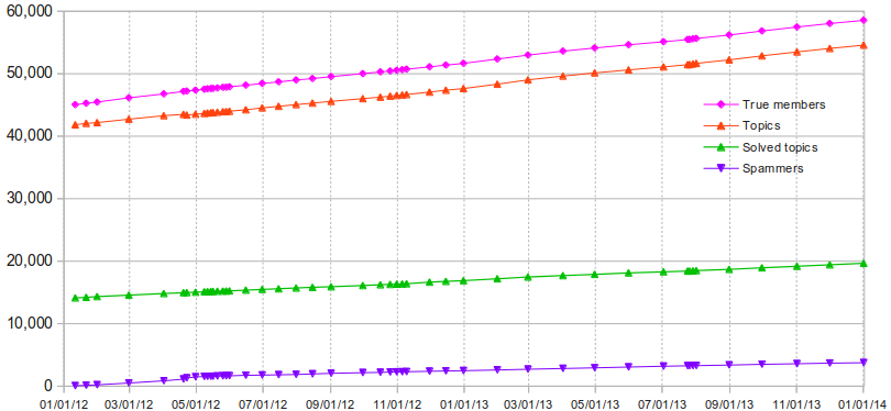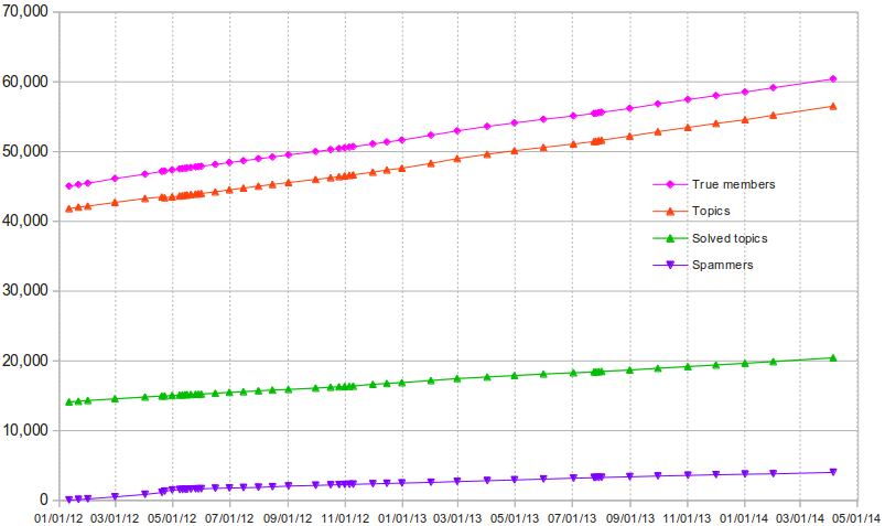 I noticed a sharp drop in the number of new posts per day over the last few weeks or months. In the past we'd get as many new posts in a day as the Apache user mailing list in a month. Maybe most regular questions can now be solved by searching the forum, or maybe something else is going on.