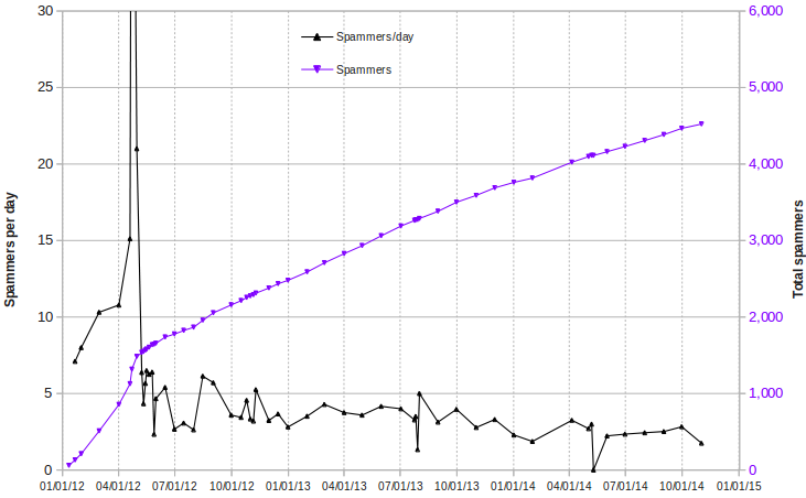 I've set a smaller scale for the rate to have a better view since most of the range is lower than 5 spammers per day.