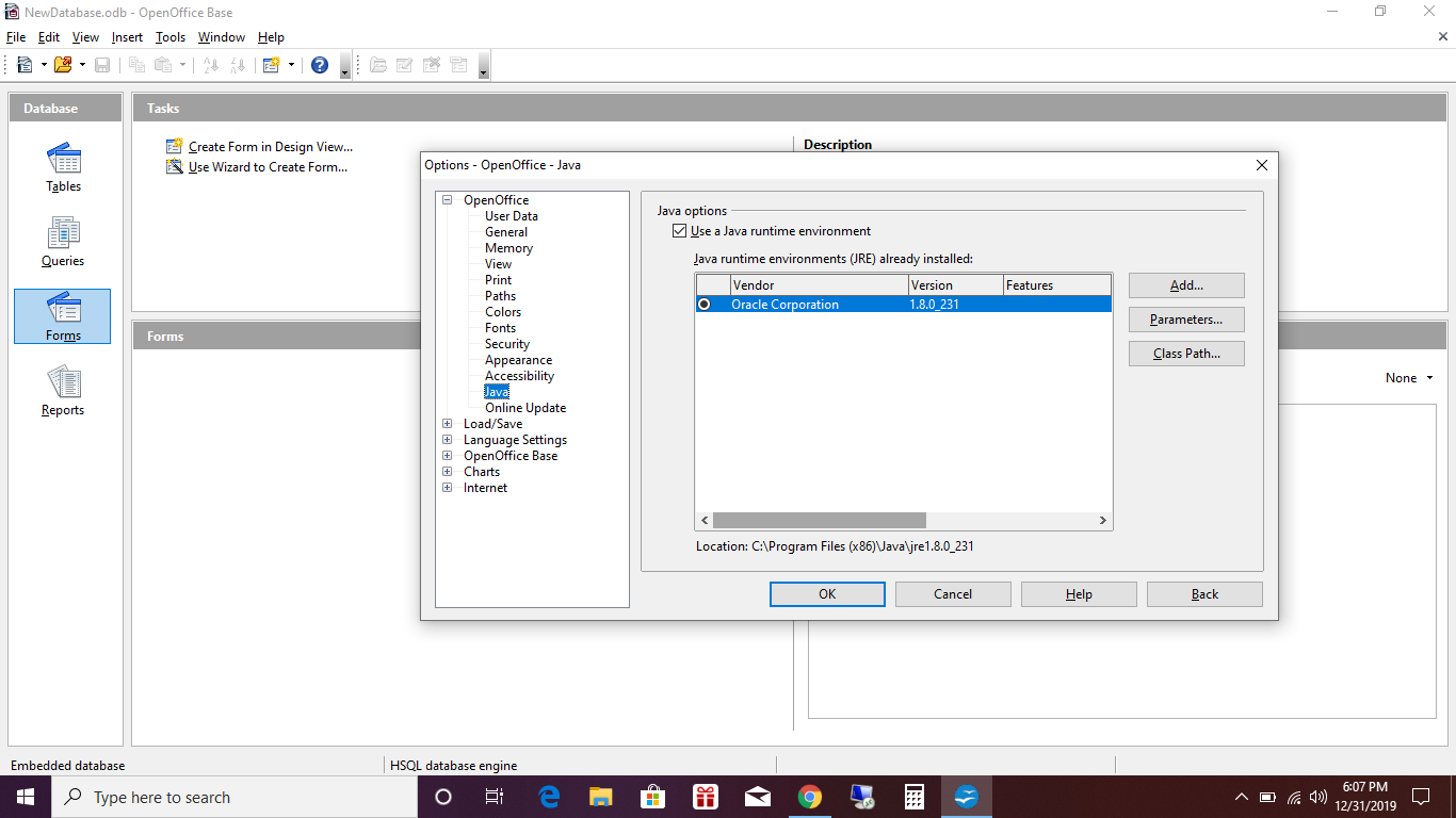 have you installed and then selected a 32-bit Java-version in Menu /Tools/Options ... OpenOffice-> Java?