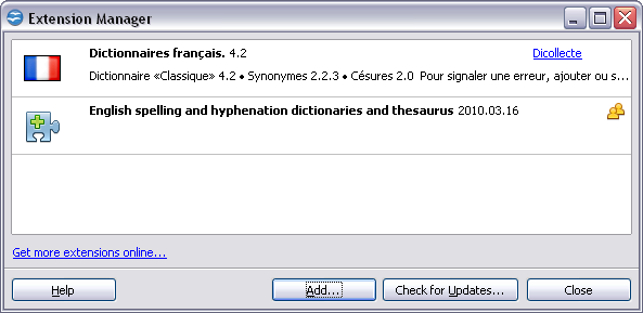Check that the extension corresponding to the language you want appears: NB: if you see a "multi-user" icon, it just means that the extension is installed for all the users of the computer (English dictionary above), else, it means that the extension is in the user profile and is available for the current user only (French dictionary above).