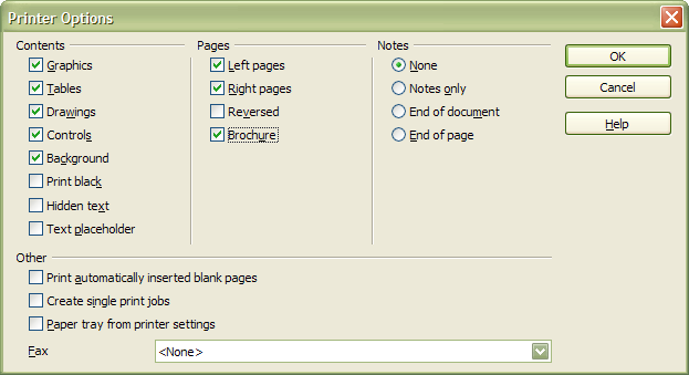 The pages that are printed on the sheets (apart from the center pages) are not consecutive. In a 36 page brochure for example, the sheet that has page 6 on it (on the left) has page 31 on the right of it. And on the back of that same sheet you have page 5 on the right and page 32 on the left. Working out this layout for a large document can be both confusing and time consuming. The good news is that OOo will take care of the arrangement of the pages for you, automatically. You simply compose your document in the logical page order of 1, 2, 3, 4 and so on, and let OOo worry about putting them in the correct order for printing.