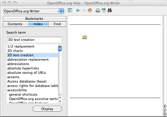 When I select the menu item Help > OpenOffice.org Help, a large window appears with the help index or contents listed nicely down the left side, but the right side panel does not work: Any particular topic I select from the contents or index only displays any icons (such as a push pins) and/or horizontal separating bars -- but never any text!