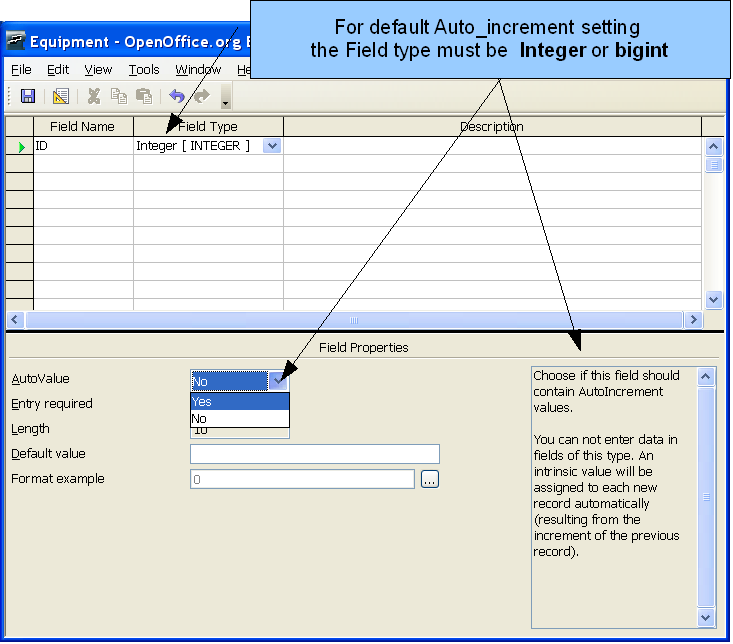 When creating a table for use in Base it is required that the table have a Primary Key field, if the table is going to be updatable via the data view window and forms. Perhaps the most common way to create this Primary Key field is with the use of an Auto_Incrementing integer field. In fact the Base table designer has support for this right in the table design window: