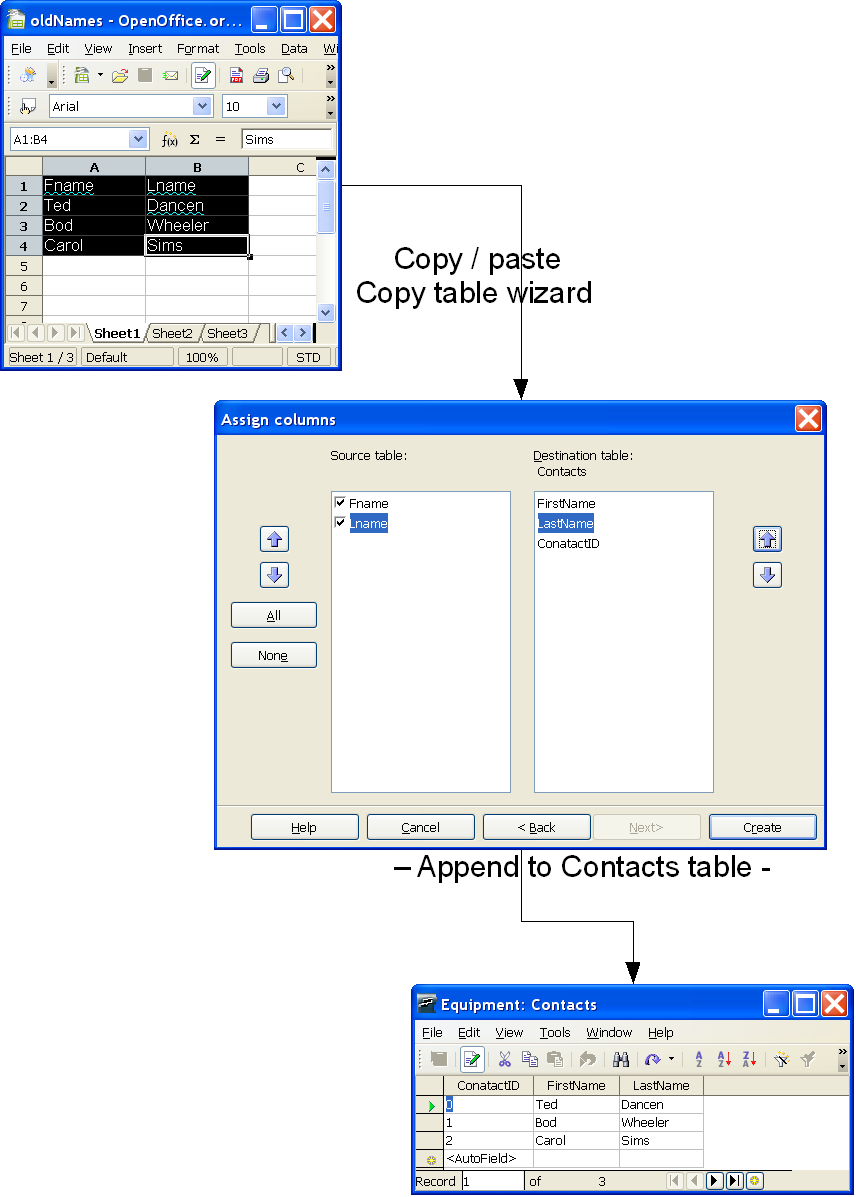 Now go to the Base window, select the Contacts table and PASTE. This will bring up the Copy Table wizard.