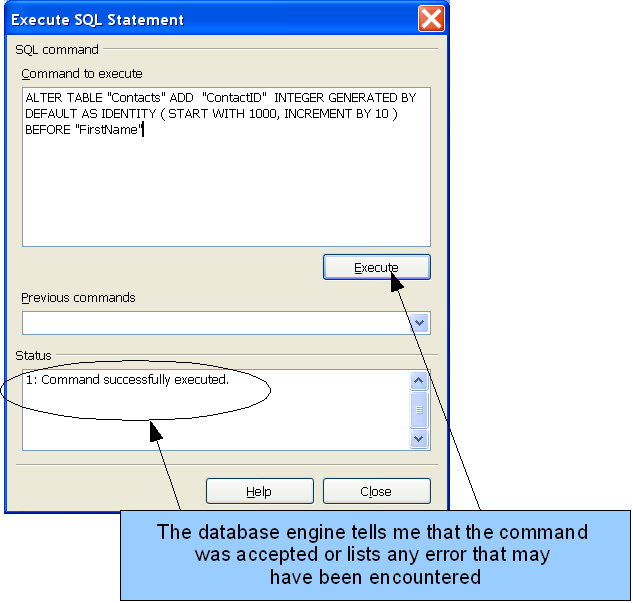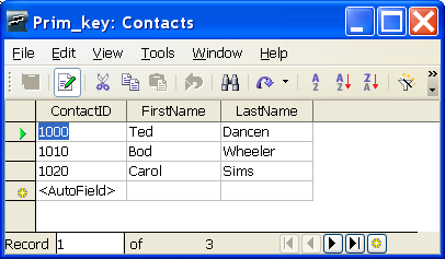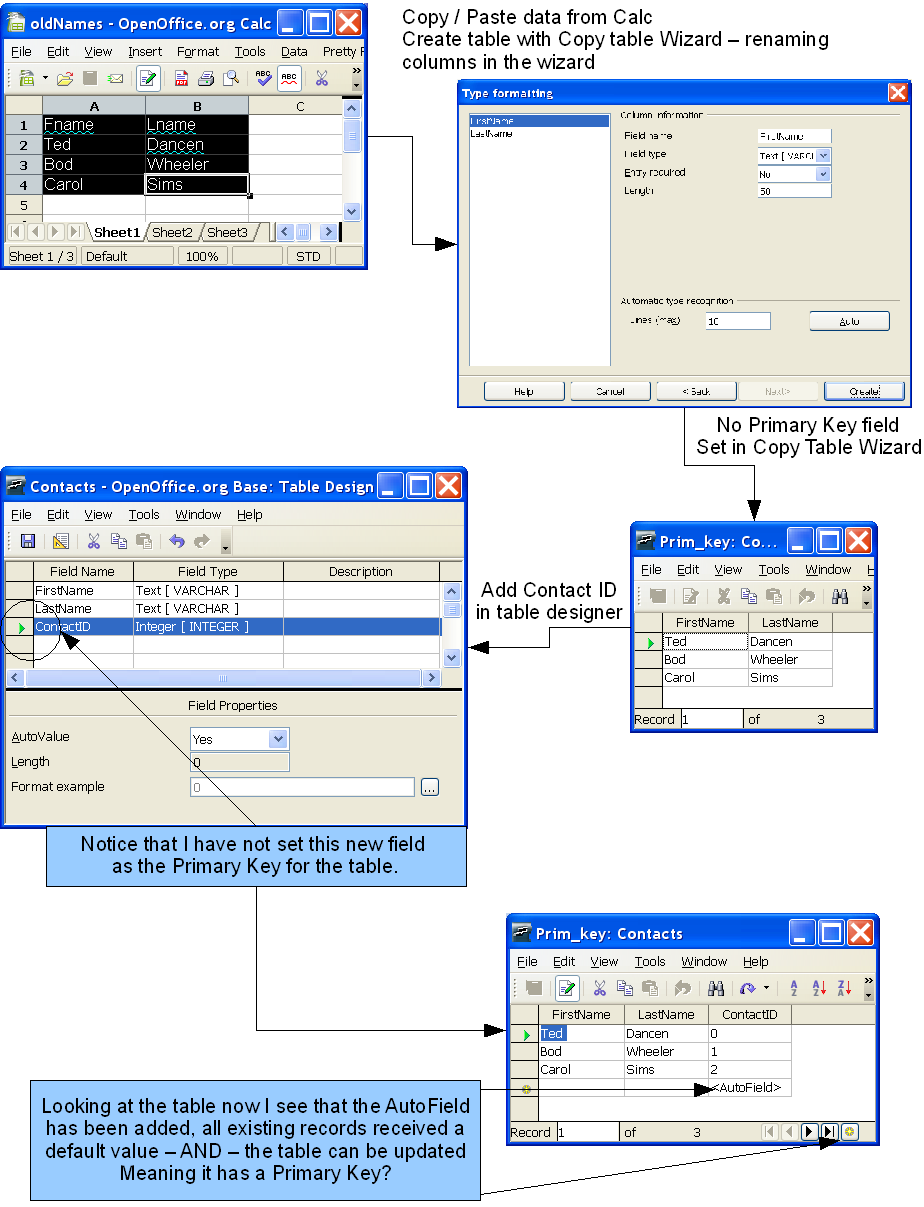 INSERT INTO "Contacts" VALUES ( NULL, "Ted", "Dancen" );How about another situation - Suppose I again have the Contacts table, but this time I also have an old SpreadSheet file with Contact information, First Name and Last Name in separate columns in the spreadsheet. Can I bring this old data into my table and still get the auto_incremented field value?