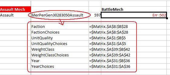 I've hit CTRL-F3 myself, and I don't see a way to take that and pick one of the named sheets (In This Case it would be the sheet "Mercenary & Periphery 3028-3050" and lookup on the Assault table section from it using the number in G5 to match the range in that table's column's A&B