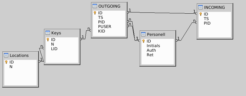 Table "INCOMING" records all events where an OUTGOING event is “closed” by an authorized person (the key is back again). The incoming event records the outgoing ID, a time stamp and the receiving autority.