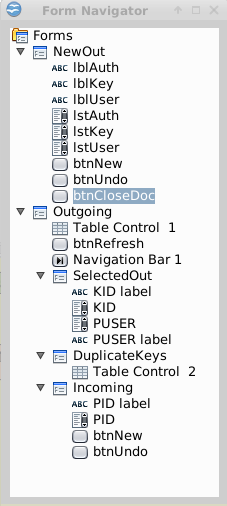 What the navigator window does not show: Columns #2 to #5 of the main grid hold numeric IDs. The numeric IDs are masked by list boxes showing the respective names of persons and keys. While in form design mode right-click a column header and get the column properties in order to see what I mean.