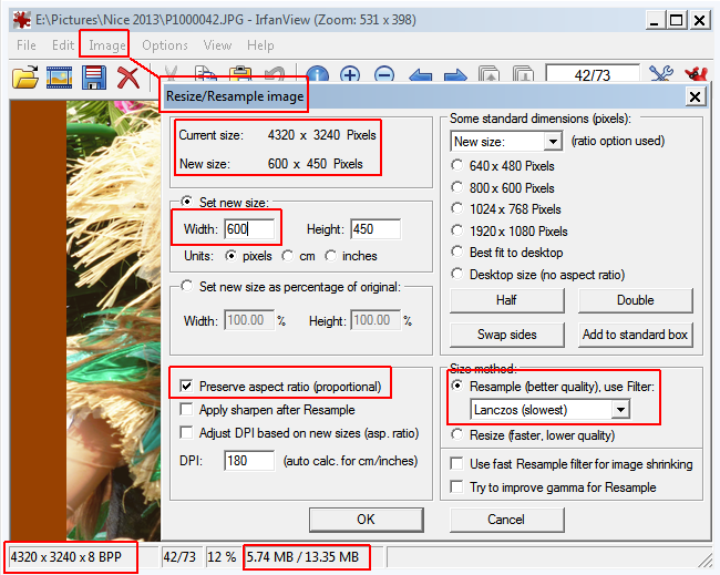 So re-sample the image to be 600 pixels wide using an image editor. An image which is 600 pixels wide will have a file which is 25x smaller than the same image at 3,000 pixels wide. Open the image in IrfanView (or any image editor) and go Image > Resize/Resample.