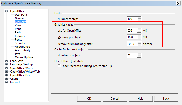 | Edit: If you are using AOO then making the following adjustments in Tools > Options > OpenOffice > Memory ..., may reduce the probability of image loss by minimising the risk that images are moved from memory to disk. Note however that LO has removed these settings from casual user change and placed them in Advanced Settings. 1. Minimise the images file size (ie MBytes as stored in the AOO file) - see this tutorial. It is the size of the JPG file (not pasted!!) or the PNG file. 2. Set the Graphics cache to 255 MB - it is the maximum allowed 3. If the maximum image file size is 1.5MB, then set Memory per object to 1.6 or 2.0 MB - this allows more images to remain in memory 4. If you set Memory per object to 2MB in 3. above, set Number of objects to 255/2 = 127 images. That maximises the chance of all images staying in memory and none being swapped out to disk when it is suspected the images are lost. |