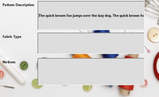 I am a novice at creating databases but when my Aunt asked me to create a database for her sewing pattern collection I could not say no.  I have created a table and form and both seem to be working correctly.  However, I am having some difficulty with having the text wrap in a field.  I have attached a picture of the issue.  Any insights and help would be greatly appreciated.  Thank you.