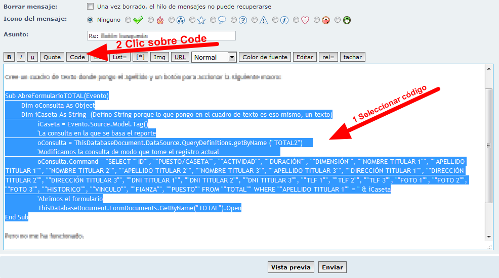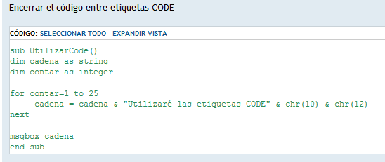 Cómo se utilizan las etiquetas [code] para encerrar código de macros y que los mensajes sean más legibles.