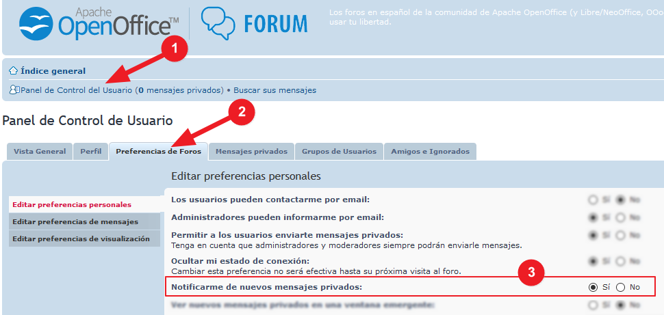 Donde encontrar los mensajes privados recibidos, o configurar el aviso por correo.