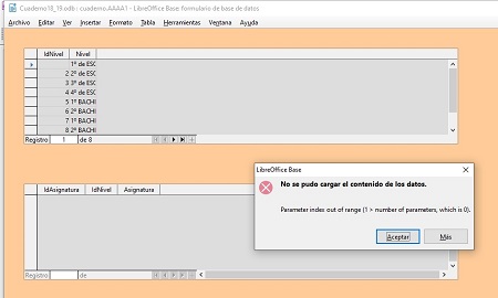 Tengo una base de datos en MySQL y me conecto a ella con OpenOffice y libreoffice. El caso es que tras actualizar libreoffice versión: 6.1.5.2 (x64) y abrir formularios que contienen subformularios me da un error "Parameter index out of range (1 > number of parameters, which is 0)." y no carga los datos. Este error no ocurría con la anterior versión y no me ocurre con OpenOffice.