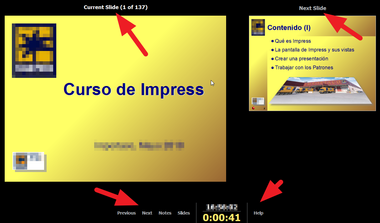 Impress, cuando realizas una presentación con dos monitores en modo escritorio expandido, en la pantalla principal se muestra la presentación, y en la secundaria, la pantalla del orador.