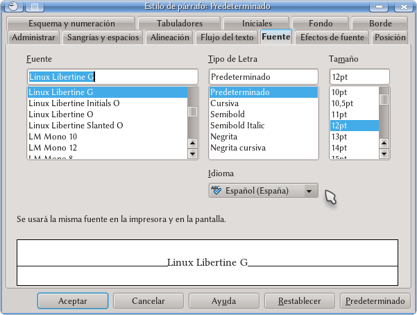Como ya he comentado en la guía de estilos y plantillas, los estilos tanto de párrafo como de carácter en Writer pueden definir el idioma del texto. El estilo llamado «Predeterminado» es el primero que se debería revisar ya que muchos estilos de párrafo están vinculados con él y por lo tanto pueden heredar su configuración de lenguaje. Edite por lo tanto el estilo de párrafo «Predeterminado» y asegúrese que en la pestaña Fuente esté seleccionado el idioma correcto (y que este tenga la marca «ABC✓»…). Si ese estilo de párrafo está correcto, asegúrese que los otros estilos utilizados no muestren cambios en el idioma: este problema es muy común con archivos importados de M$Office.