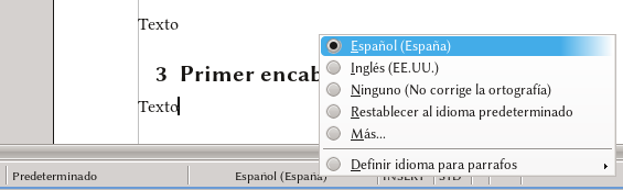 • NOTA: a partir de la versión 3.2, aplicar «formato predeterminado» en Writer no borra la configuración del idioma realizada manualmente. OOo 3.3 agrega un ítem en el menú de idioma que surge al hacer clic sobre el nombre del idioma en la barra de estado (parte inferior de la ventana) que permite volver al idioma predeterminado del estilo de párrafo. Para quienes no puedan actualizar a 3.3, la única opción para volver al idioma predefinido es «cortar» el texto (Ctrl+X) y pegar sin formato (Ctrl+Mayúsculas+Alt+V)
