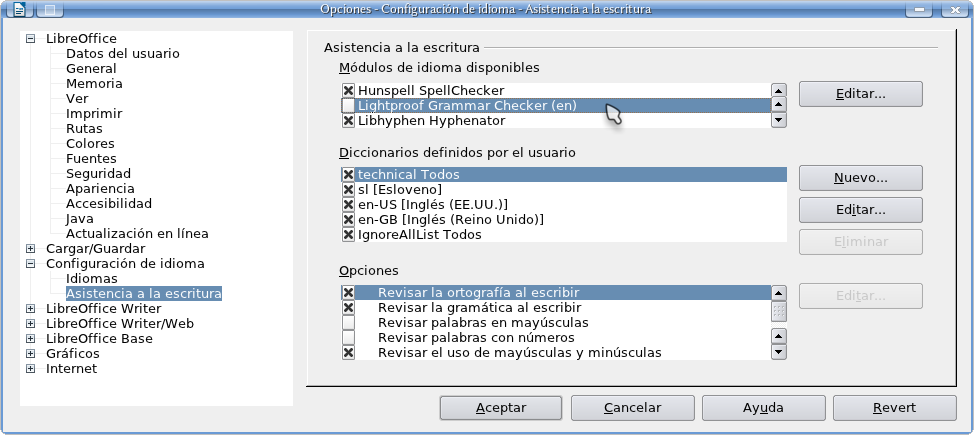 NOTA IMPORTANTE 1: para usuarios de LibO a partir de la versión 3.5 que quieran utilizar LanguageTool deben deshabilitar (Herramientas → Opciones → Configuración de idioma → Asistencia a la escritura) el simple corrector gramatical (lightproof) que viene integrado